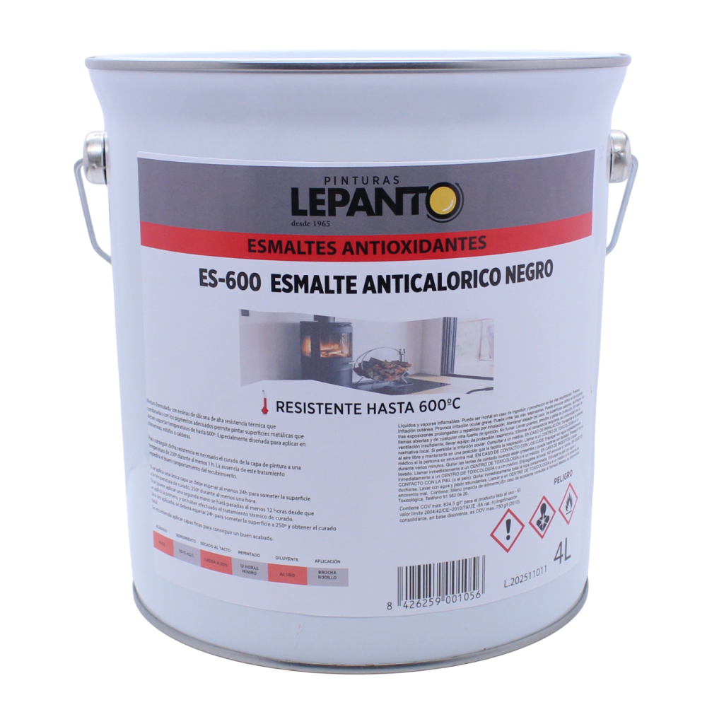 Pintura formulada con resinas de silicona de alta resistencia térmica que combinadas con los pigmentos adecuados permite pintar superficies metálicas que deban soportar temperaturas de hasta 600ºC. Especialmente diseñada para chimeneas, estufas o calderas.